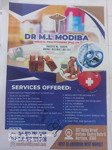 Dr ML Modiba is situated on 267 Suite no.6, Botha Street, Haffson Centre, Northam